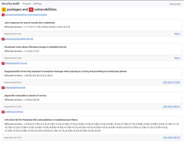 C'est simple, gratuit, vous pouvez faire ça vous même. Mais bientôt vous pourrez auditer simplement vos applications à partir d'un repot Git publique ou d'un simple fichier composer.lock . En vous inscrivant vous serez alertés en cas de nouvelles failles de sécurité sur vos projets :