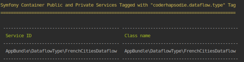 If your dataflow is not in the output, check if your service uses Symfony auto-configuration. If you don't use auto-configuration, check if the dataflow type class is correctly configured in your service.yml file with the tag coderhapsodie.dataflow.type .