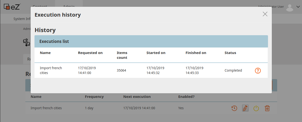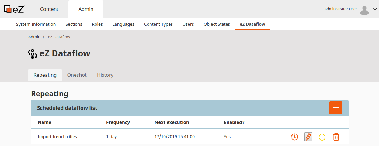 On eZ Dataflow back-office page, the scheduled dataflow list contains one line. This job will be executed automatically by the Symfony command previously added in the crontab.