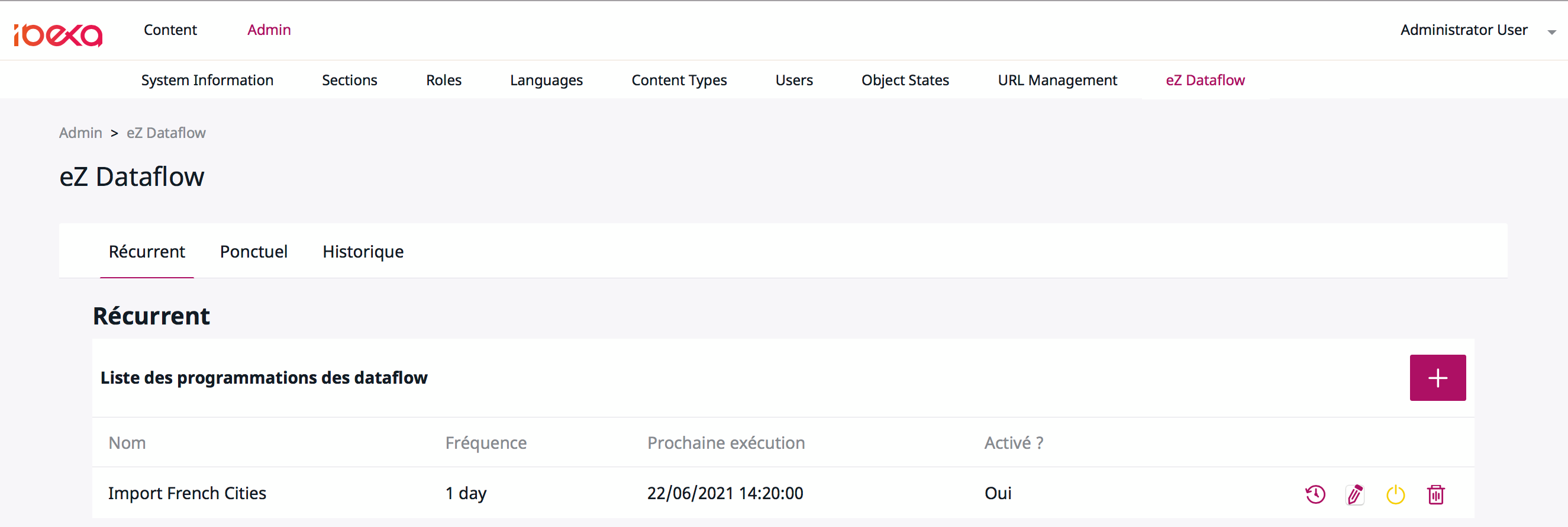 On eZ Dataflow back-office page, the scheduled dataflow list contains one line. This job will be executed automatically by the Symfony command previously added in the crontab.