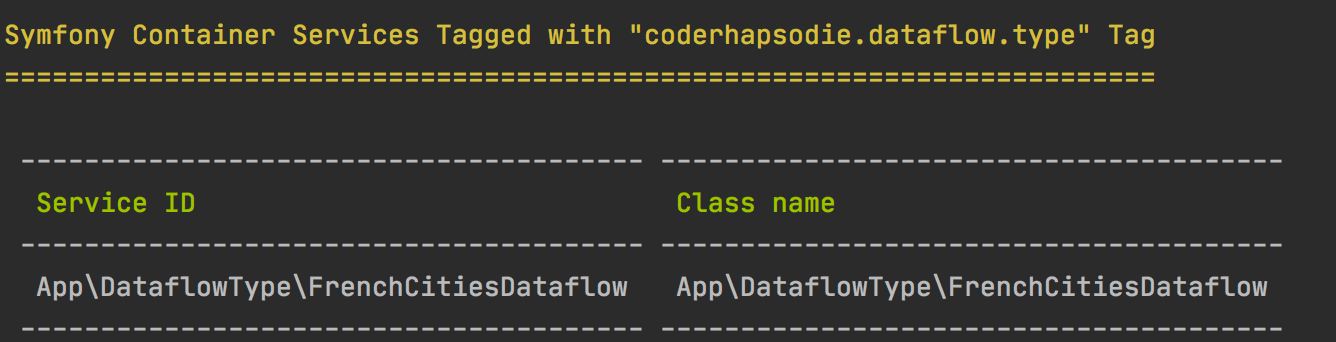 If your dataflow is not in the output, check if your service uses Symfony auto-configuration. If you don't use auto-configuration, check if the dataflow type class is correctly configured in your service.yml file with the tag coderhapsodie.dataflow.type .