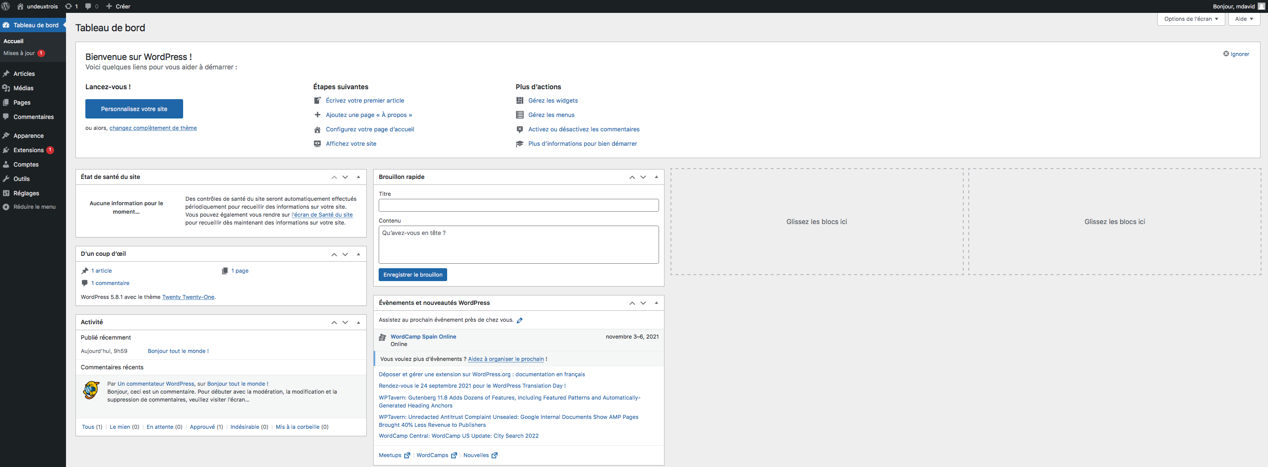 Pour un futur projet, il était essentiel que je me plonge dans la découverte de l'outil Wordpress. N'ayant jamais utilisé cet outil, j'ai dû donc mettre la main à la pâte et commencer à m'auto-former sur les bases et l'utilisation de Wordpress (dernière version 5.8.1).