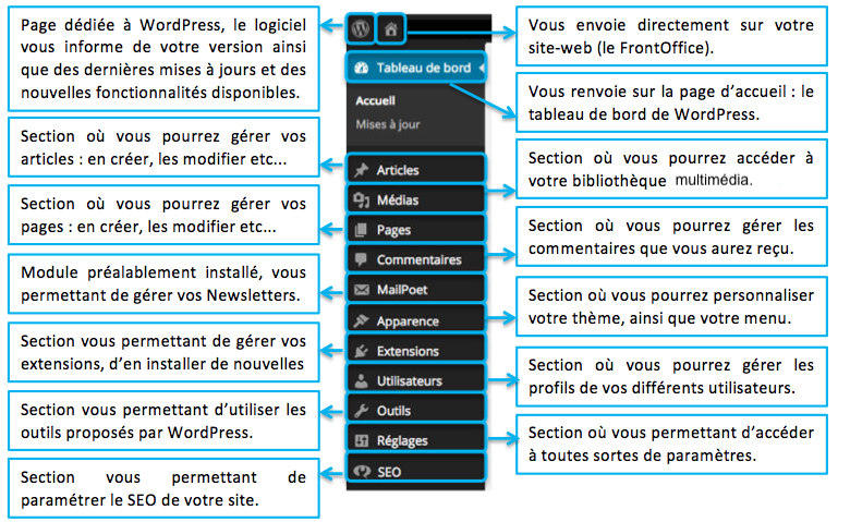 Le menu de Wordpress peut être évolutif car je peux installer des modules ou des extensions permettant d'ajouter des fonctionnalités à mon site web. Voyons plus en détails l'utilité de chacun de ces éléments :