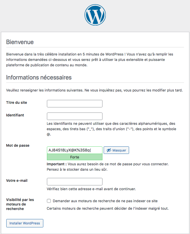 J'ai rempli les champs de ce formulaire puis j'ai cliqué sur le bouton "Installez Wordpress". L'identifiant et le mot de passe correspondent à la connexion au back-office. Ces champs pourront être modifiés plus tard dans le back-office.