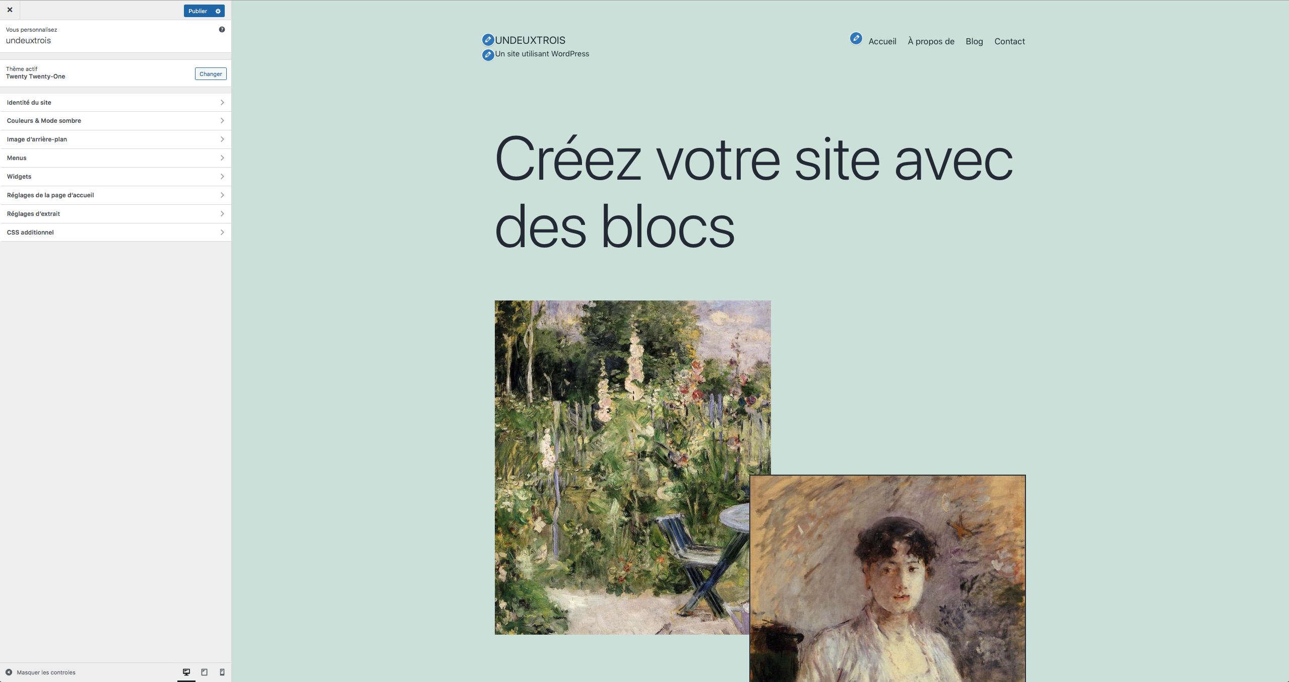 Il s'agit d'une personnalisation plus en profondeur de mon site web (Menus, Widgets, Logo miniature du site, Image de fond, Couleurs etc..). J'ai également la possibilité de modifier mon site web en cross platform (Portable, Tablette, Ordinateur) en cliquant sur les 3 icônes (en bas à gauche).